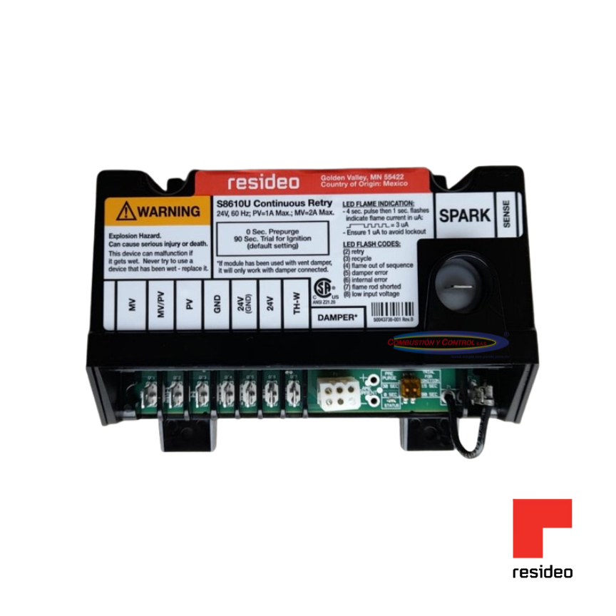 El S8610U Módulo Universal de Piloto Intermitente está previsto para proporcionar reemplazo fácil en el campo de una variedad amplia de módulos de ignición con piloto intermitente fabricados por Honeywell. El módulo S8610U proporciona secuencia de ignición, monitoreó de flama y cierre de seguridad para caloríferos centrales con piloto intermitente, calderas residenciales y otros tipos de aparatos de calefacción.
